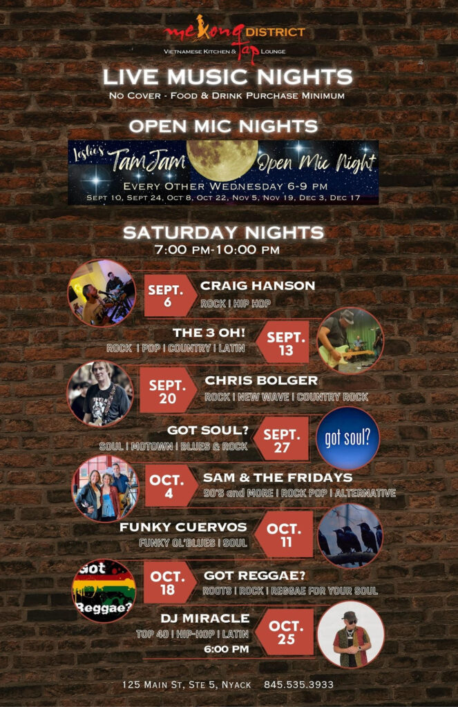 This Saturday, September 20th, Mekong District brings you live music from 7-10pm. This week’s musician is Chris Bolger, playing rock, new wave, and country rock favorites. Mekong District is a unique restaurant that has it all with a hip atmosphere, delectable Vietnamese-inspired food, and Rockland’s first self-pour tap bar. With these fun acts on Saturday nights, as well as the Tam Jam Open Mic Night every other Wednesday, Mekong District is starting to look like your home away from home!